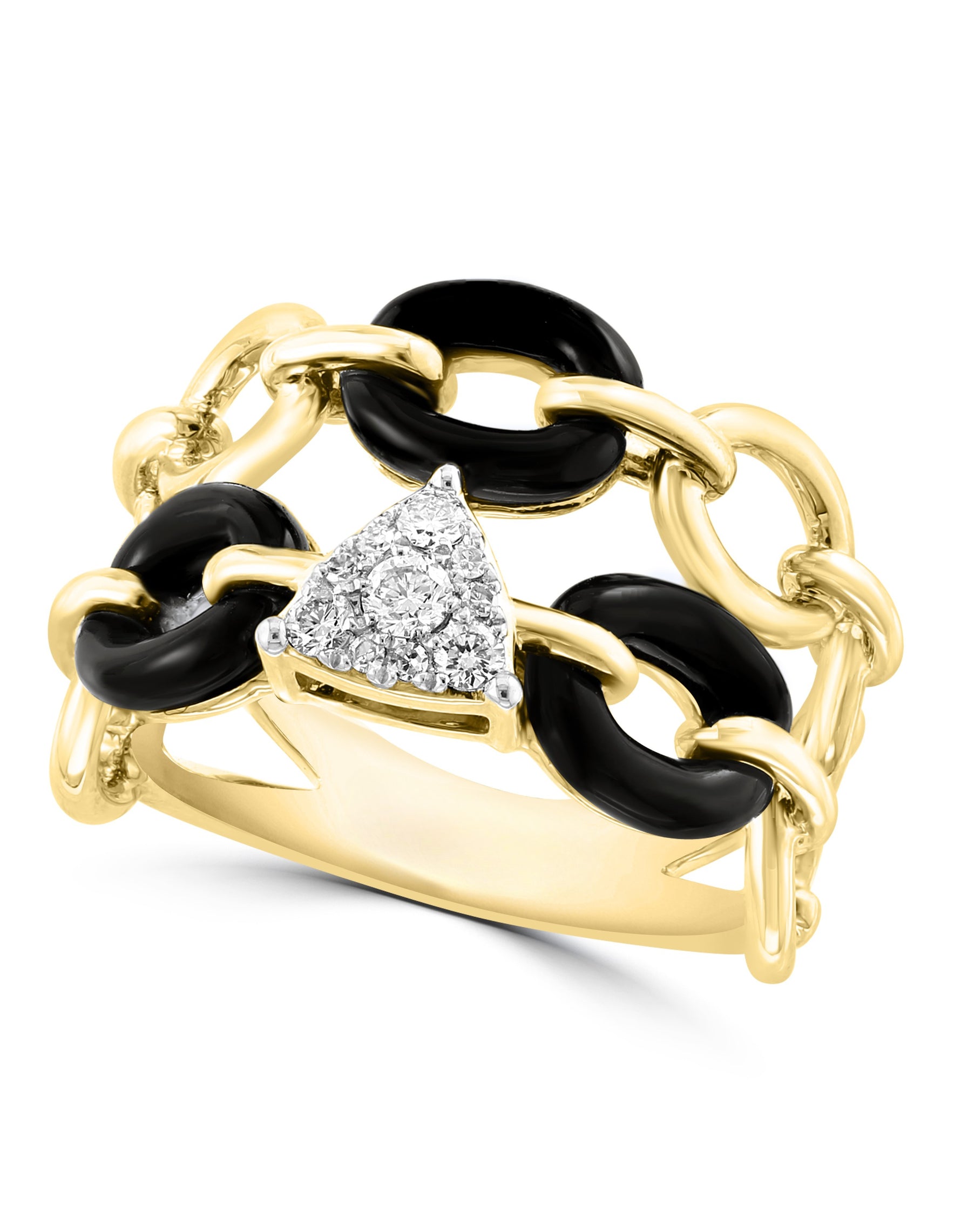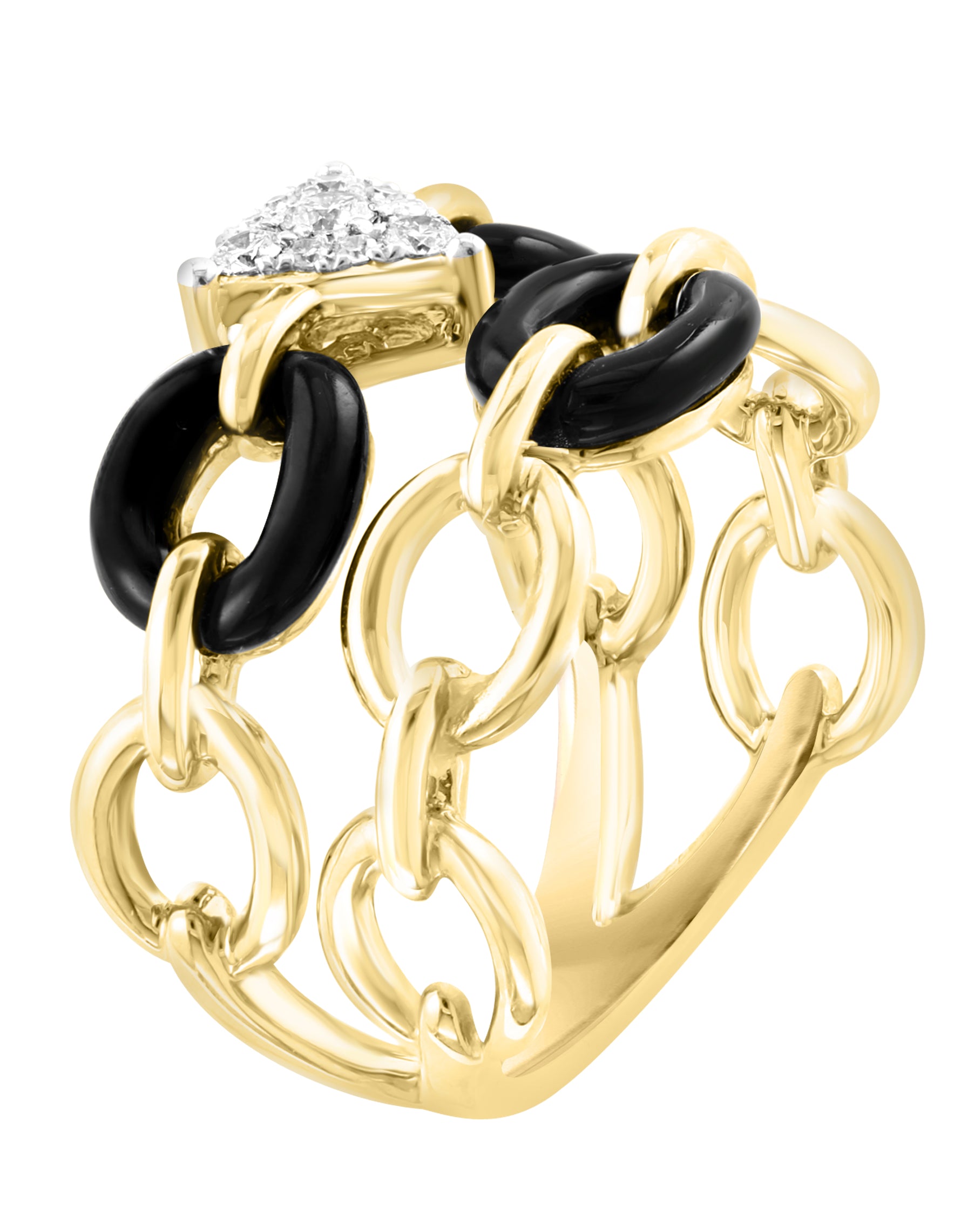Ladies Geometric Onyx & Diamond 14K Yellow Gold Ring with Oval Links accented with Black Onyx 1.75 & Triangle of Round Brilliant Cut Diamonds 0.17 ctw, size 7.
