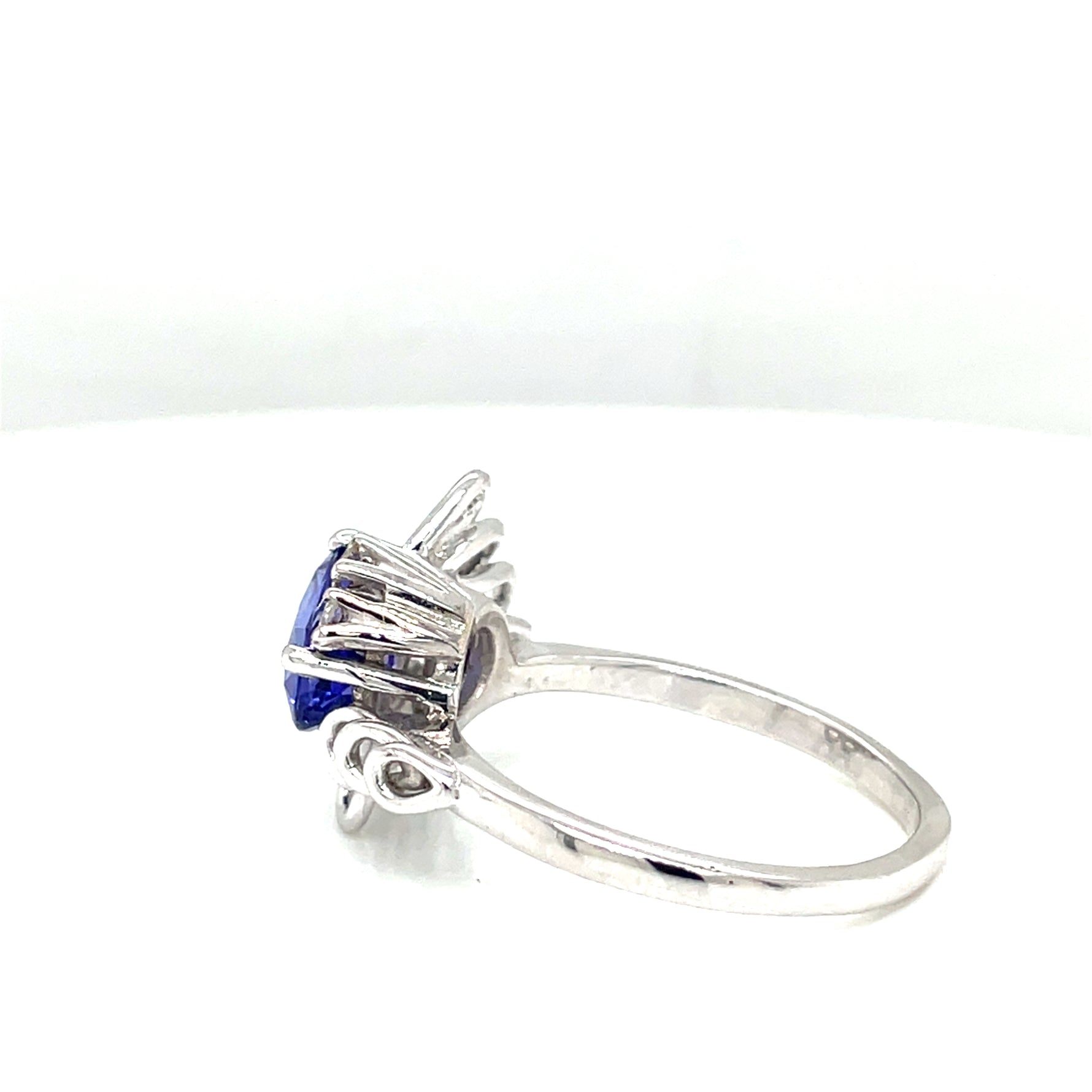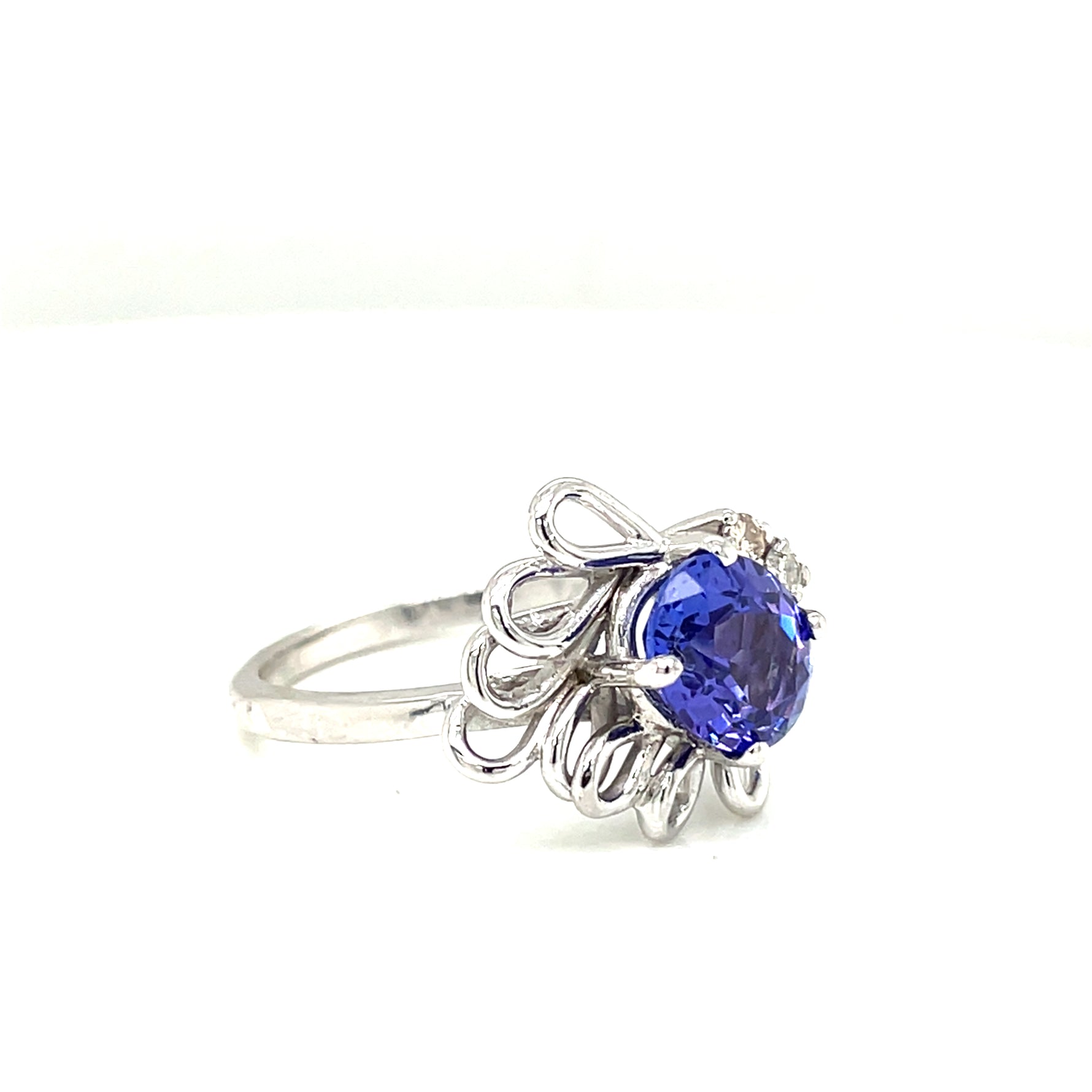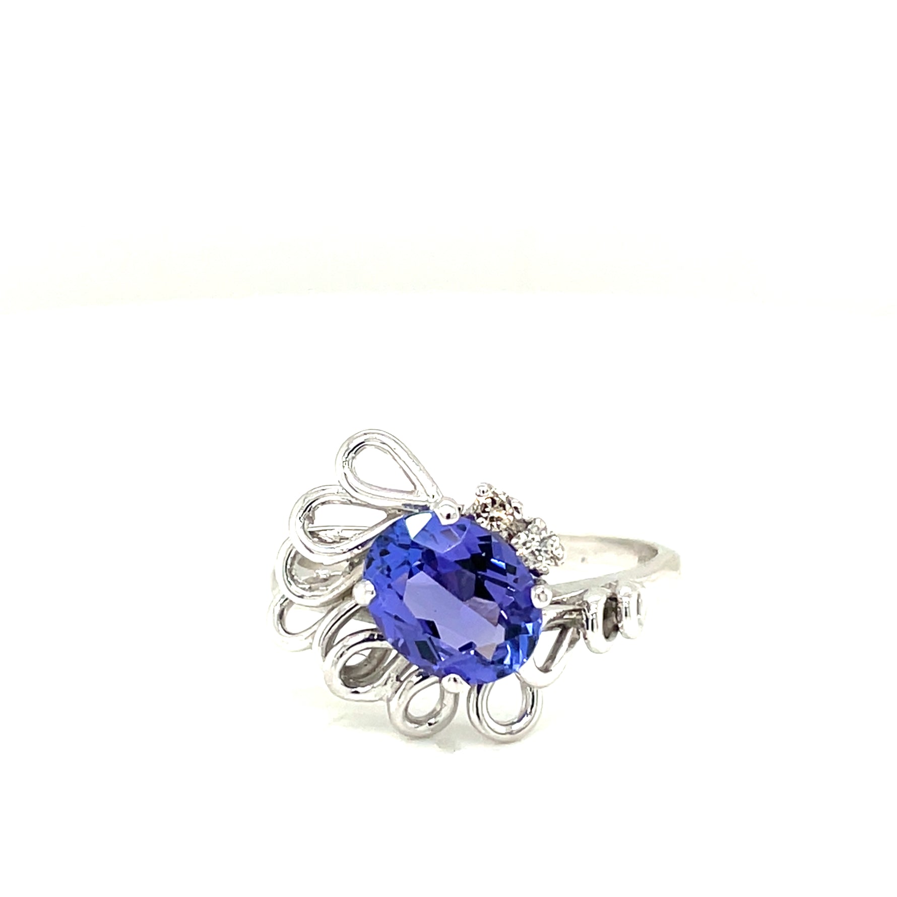 Tanzanite Free Form Flower 14K White Gold Diamond Ring with Oval Tanzanite, approximately 9 x 7mm accented by 2 Round Brilliant Cut Diamonds approximately 0.06 cts, size 9, Estate Collection