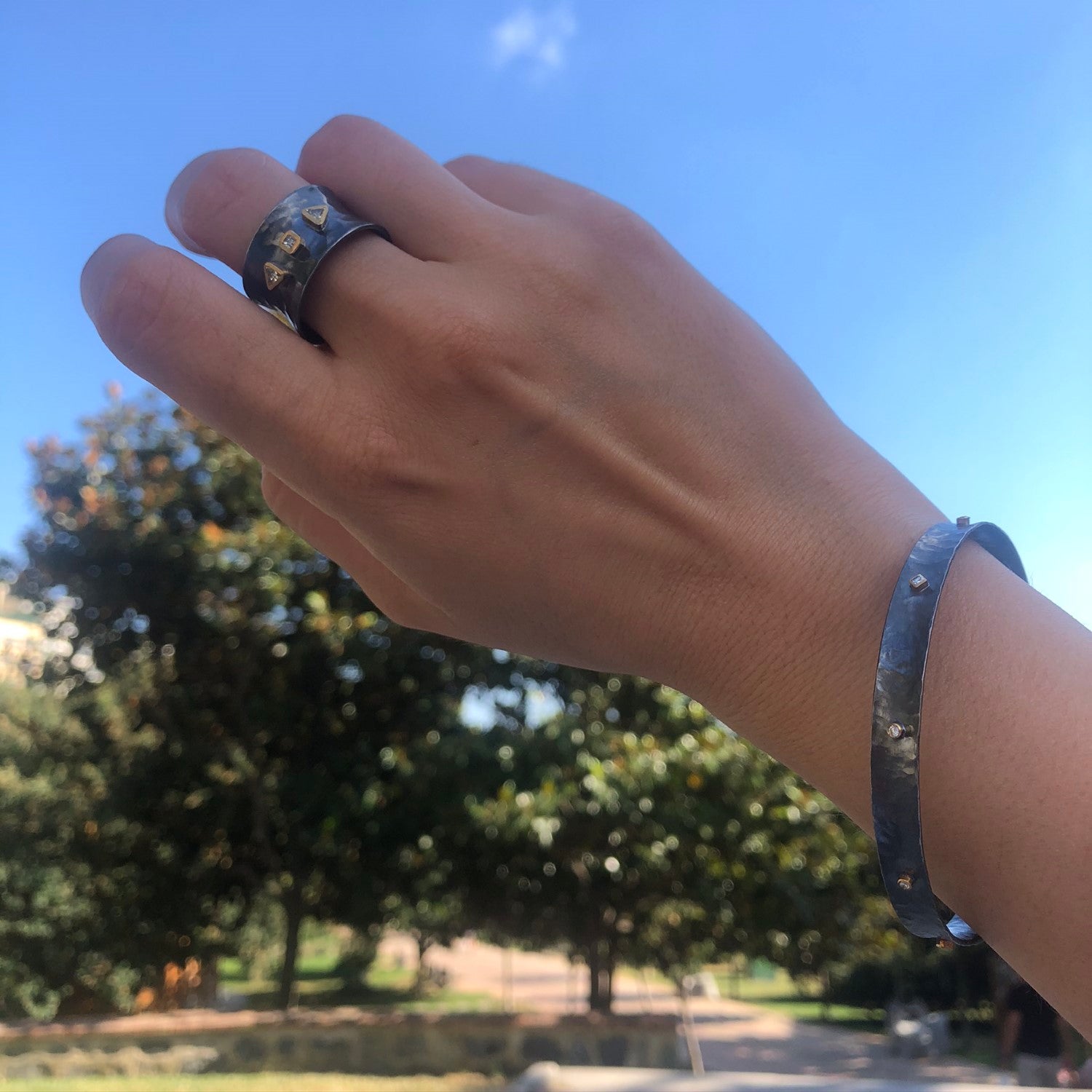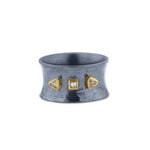 Stand out with the "Aurora" Diamond Hammered Band by Lika Behar, a fearless fusion of rich 22K yellow gold and edgy oxidized sterling silver. This 12 mm wide band showcases three brilliant diamonds totaling 0.04 ctw and vibrant yellow diamonds totaling 0.18 ctw, creating a striking contrast that commands attention. Sized at 10, it’s the perfect choice for those who dare to wear bold elegance every day.