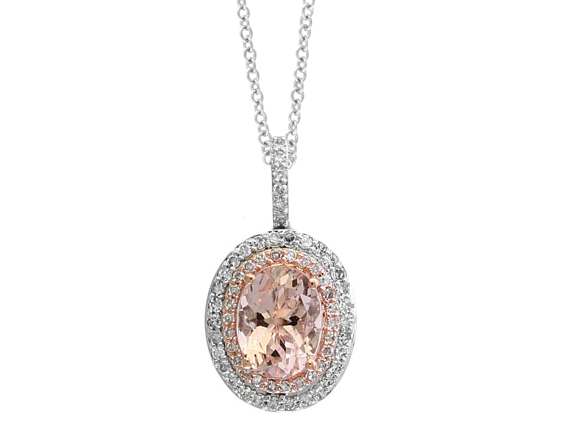 Ladies Morganite & Diamond 14K Two-Tone Rose & White Gold Double-Halo Pendant Adjustable Necklace with Oval Morganite Center Stone surrounded by Halo of Morganite Rounds 1.15 ctw set in 14K Rose Gold & surrounded by Halo of Round Brilliant Cut Diamonds 0.21 ctw set in 14K White Gold & featured on 14K White Gold Cable Chain with Lobster Clasp, Adjustable 16-18 inch length (Italy)