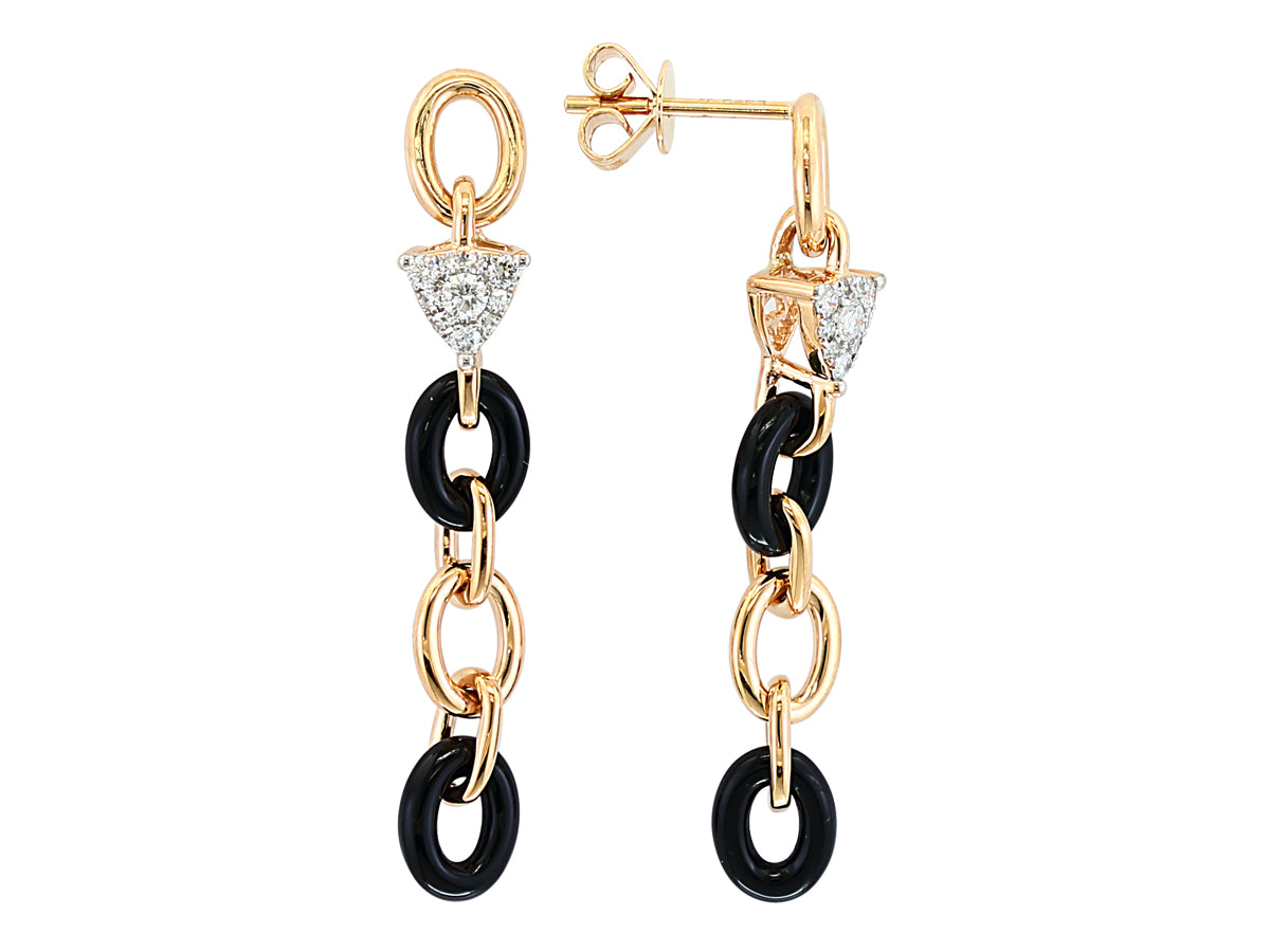 Ladies Geometric Onyx & Diamond 14K Yellow Gold Dangle Earrings with Oval Links accented by Black Onyx 2.25 ctw & Triangles of Round Brilliant Cut Diamonds 0.22 ctw. Matching Ring (SOLD SEPERATELY)