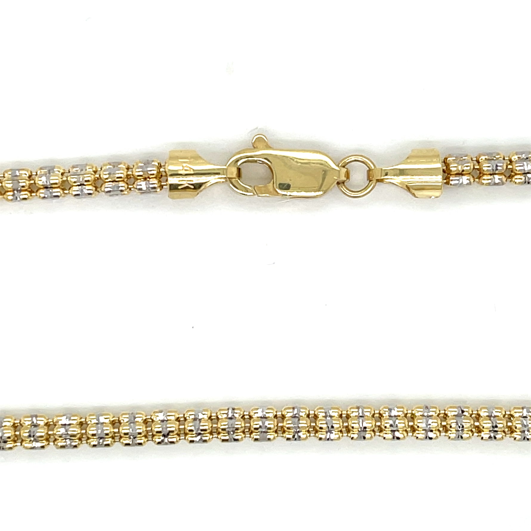 Make a bold statement with this striking two-tone necklace chain, where lustrous 14K yellow gold meets cool white gold in perfect contrast. The diamond-cut surface sparkles with audacious brilliance, commanding attention with every movement. At 24 inches, it's the ideal length to showcase your fearless style. Anchored by a secure lobster clasp, this piece demands to be worn by those who refuse to blend in.