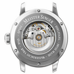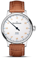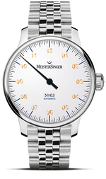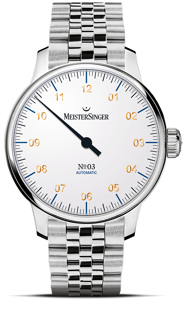 As the sister of the original MeisterSinger β„–01, the β„–03 also features all the design details that still characterize the entire collection today: The functional typography with its continuous double-digit hour numerals from 01 to 12, the circumferential line structure, and the fine, needle-shaped hour hand. A watch cannot be designed more clearly, simply, and discreetly than that. In this version, it has a glossy white dial with gold hour markers and blue and black contrasting indices. Available with metal bracelet for $180.