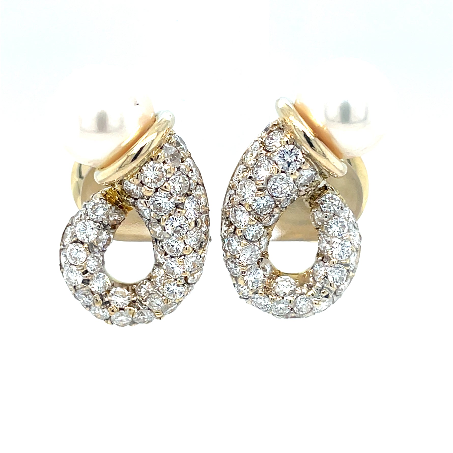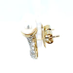 Diamond & Cultured Pearl Curling 14K Yellow Gold Earrings featuring 2 Cultured Pearls accented by Round Brilliant Cut Diamonds 1 ct, Color is G/H, Clarity is SI2, Estate Collection